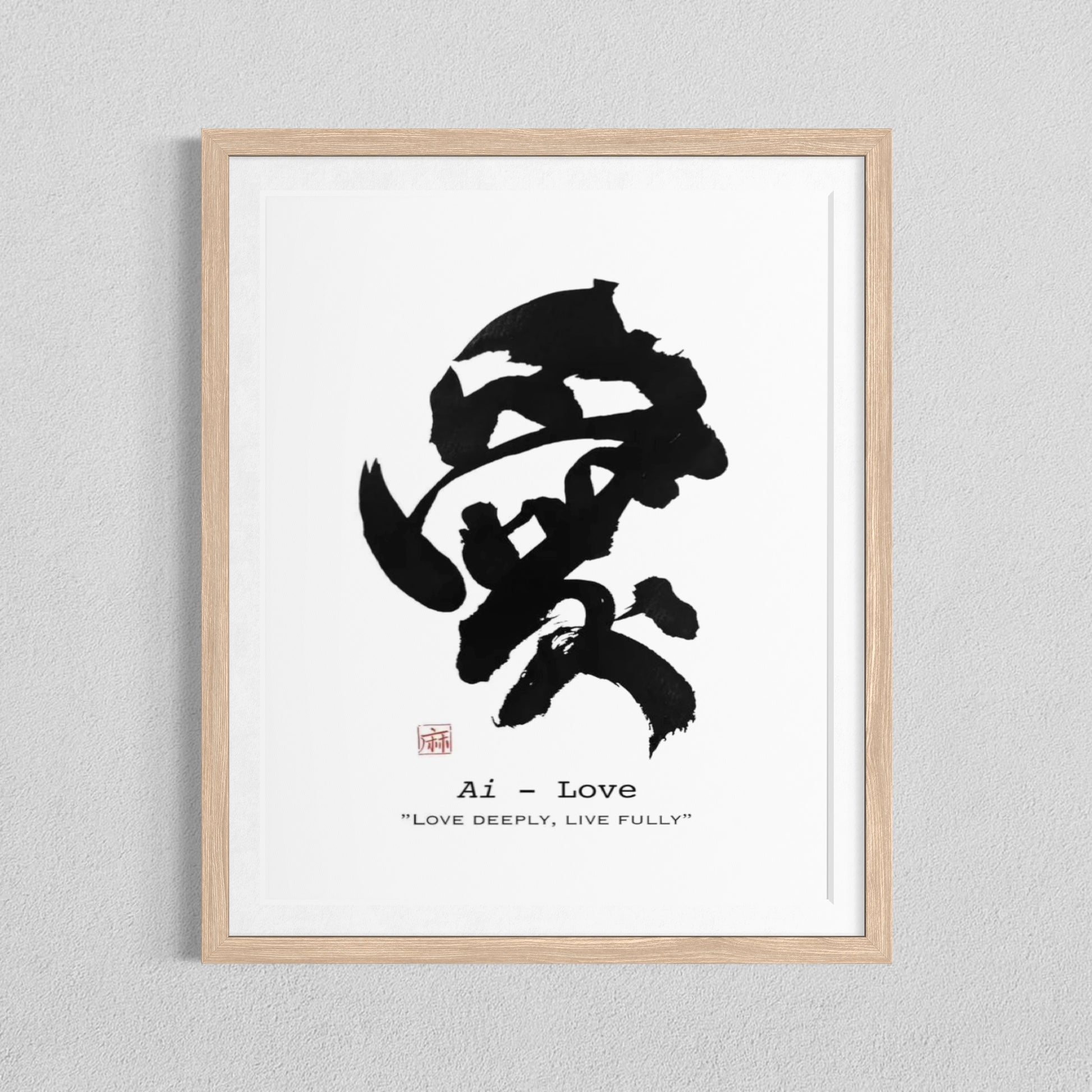 What's on the artwork: Hand-drawn calligraphy 愛 (Ai - Love) Quote: "Love Deeply, Live Fully" Pure black ink on white background Bold, dynamic brushwork with authentic texture